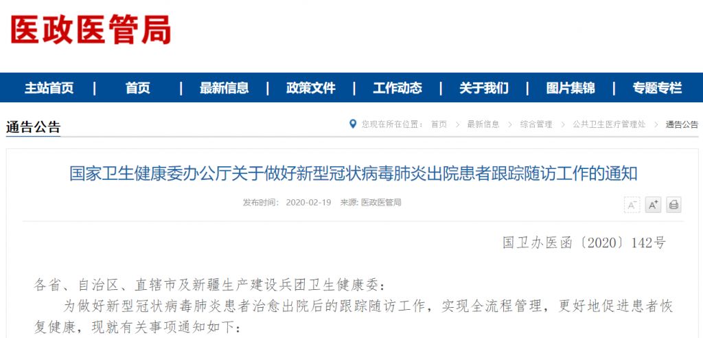 2月19日,國家衛(wèi)生健康委網(wǎng)站發(fā)布《關(guān)于做好新型冠狀病毒肺炎出院患者跟蹤隨訪工作的通知》(國衛(wèi)辦醫(yī)函〔2020〕142號)(簡稱:《通知》)?!锻ㄖ访鞔_了新型冠狀病毒肺炎出院患者跟蹤隨訪的工作流程和隨訪措施,鼓勵(lì)各地充分運(yùn)用信息手段開展隨訪,并細(xì)化了出院患者健康指導(dǎo)的具體內(nèi)容。